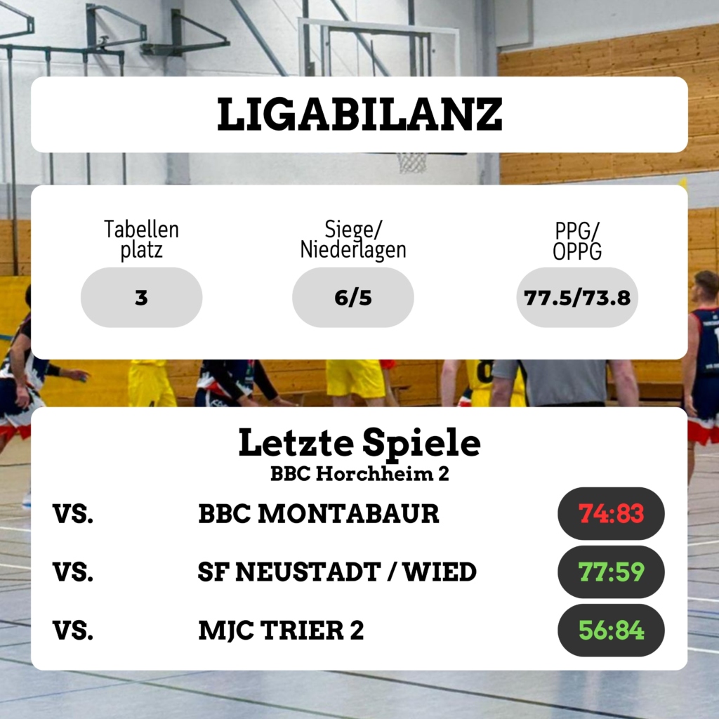Die Gäste aus Horchheim gehen als Tabellendritter in die Partie und weisen bislang eine Bilanz von sechs Siegen und fünf Niederlagen auf. Mit durchschnittlich 73,8 zugelassenen Punkten pro Spiel stellt Horchheim eine der stabileren Defensiven der Liga. Offensiv kommt die Zweitvertretung auf 77,5 Punkte im Schnitt und liegt damit unter dem Wert der Linzer Herren.