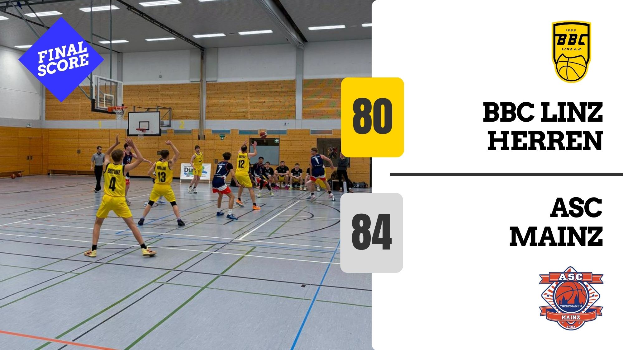 Die Herren sind im Achtelfinale des BVRP-Pokals knapp ausgeschieden. Gegen den ASC Theresianum Mainz unterlag Linz am Freitagabend in der Miesgesweghalle mit 80:84, nachdem man die Partie über weite Strecken kontrolliert hatte.